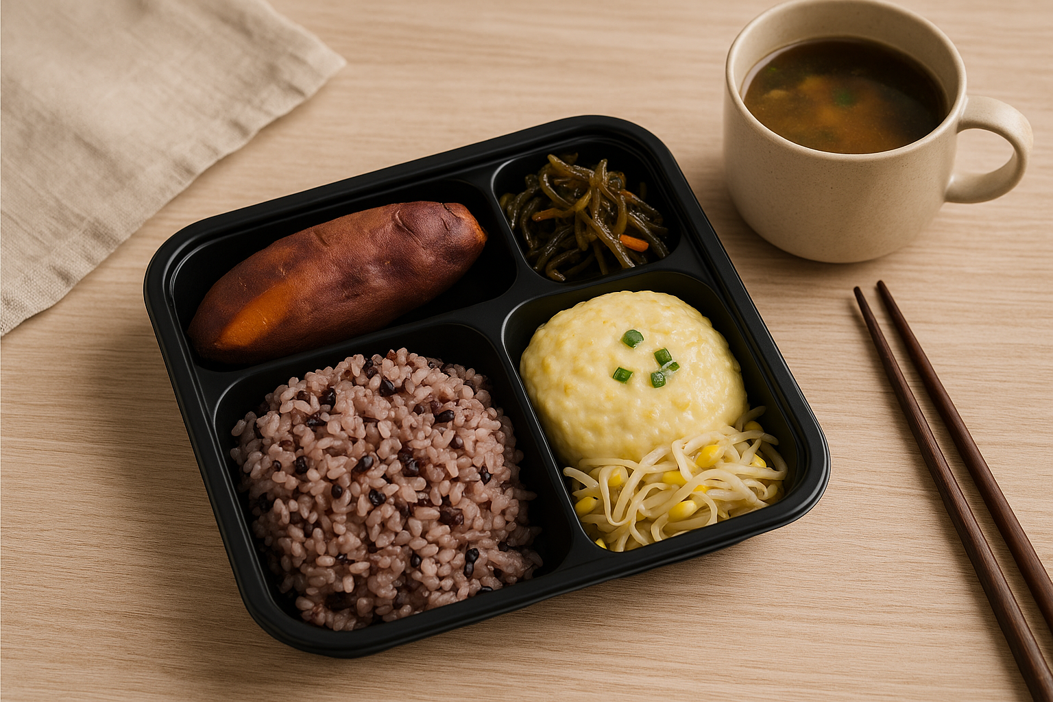 - 구성: 고구마 / 계란찜 / 미역줄기볶음 / 콩나물무침 / 흑미밥